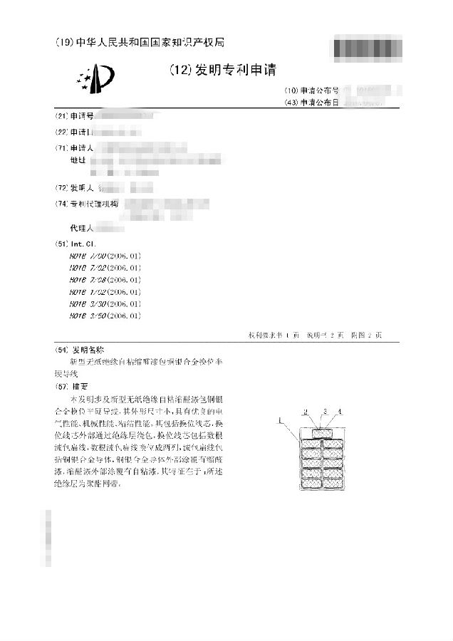 專(zhuān)利轉讓—— 新型無(wú)紙絕緣自粘縮醛漆包銅銀合金換位半硬導線(xiàn)(發(fā)明專(zhuān)利)